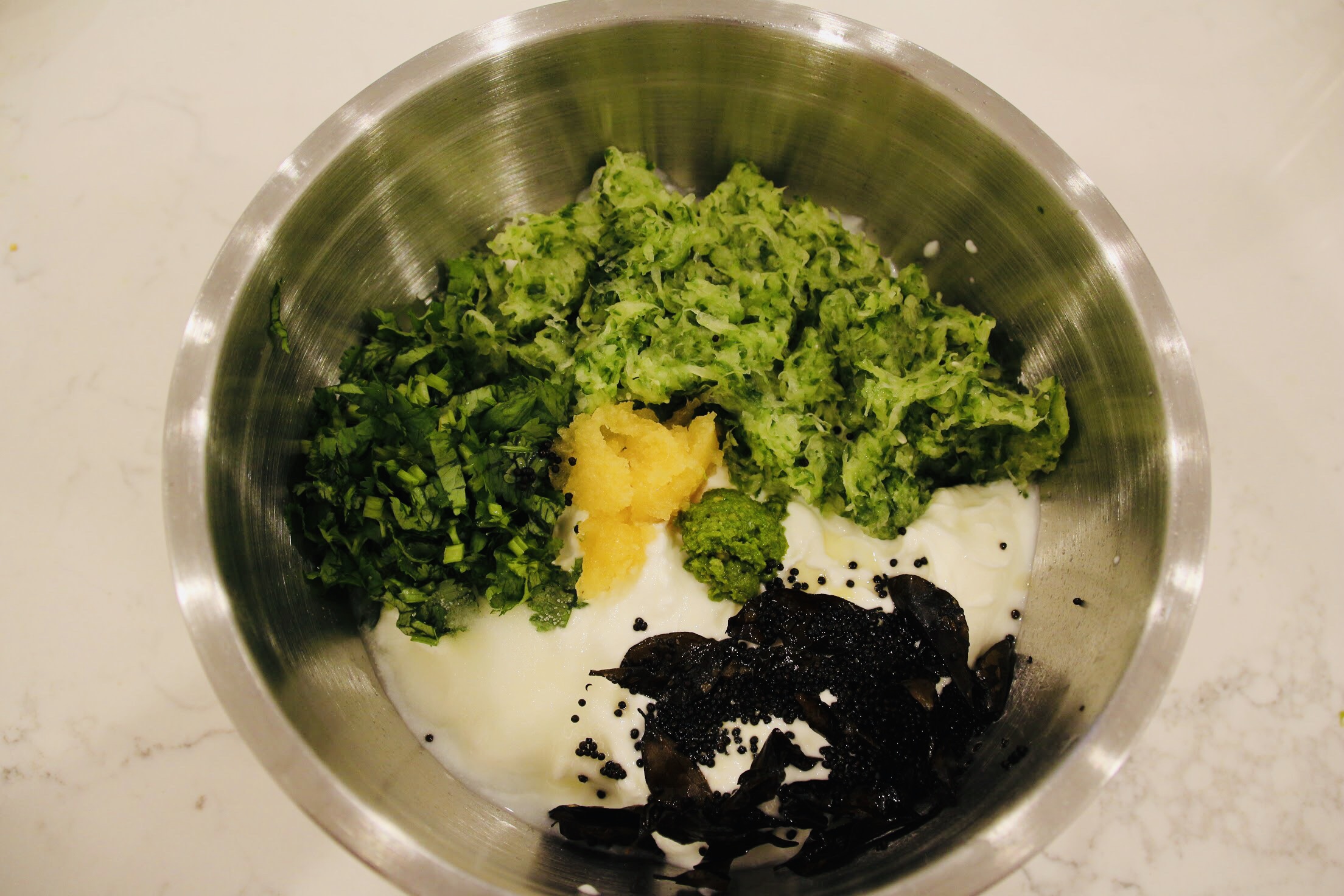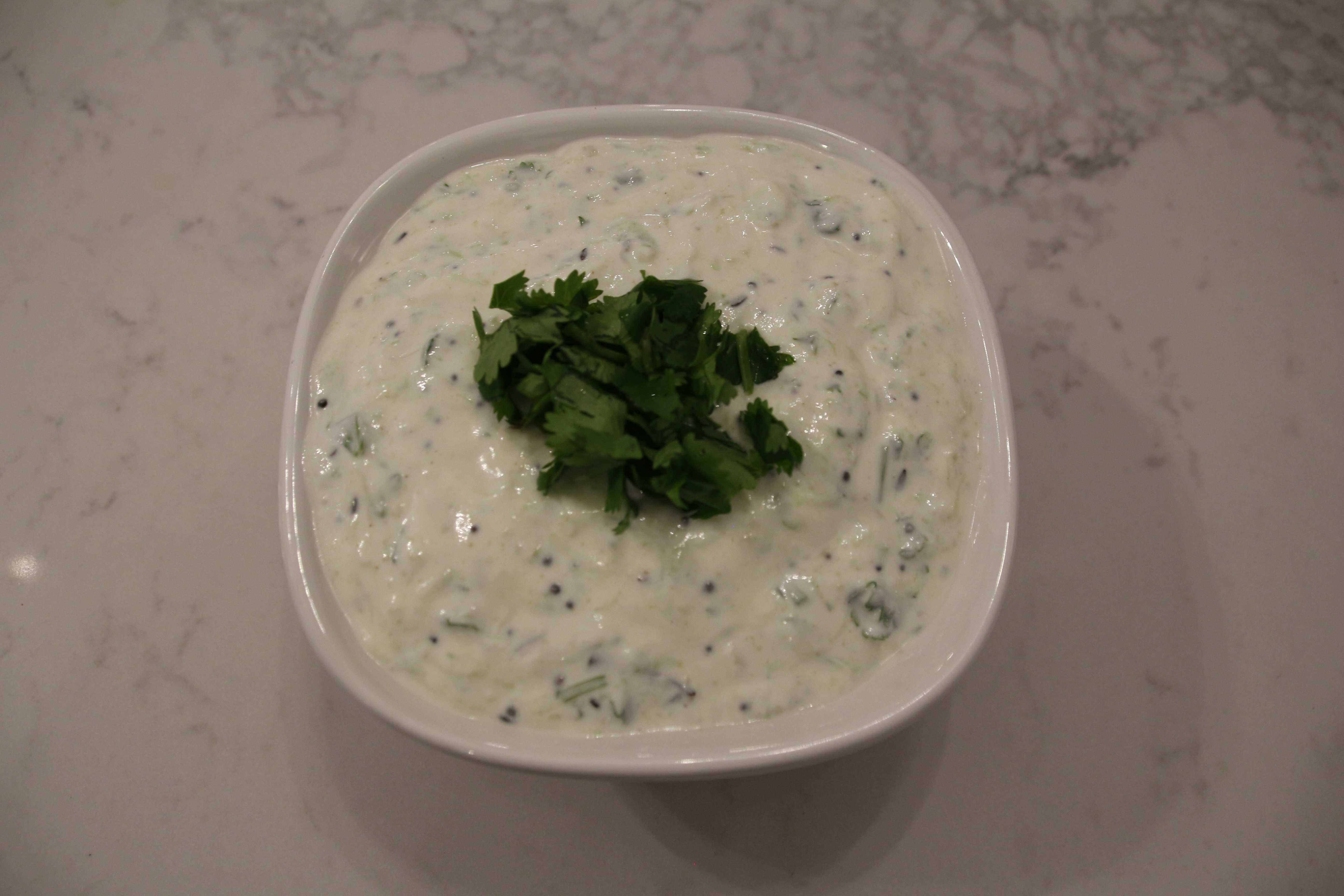 3. In a mixing bowl, add the yogourt, cucumbers, garlic, green chilies, salt and sugar.