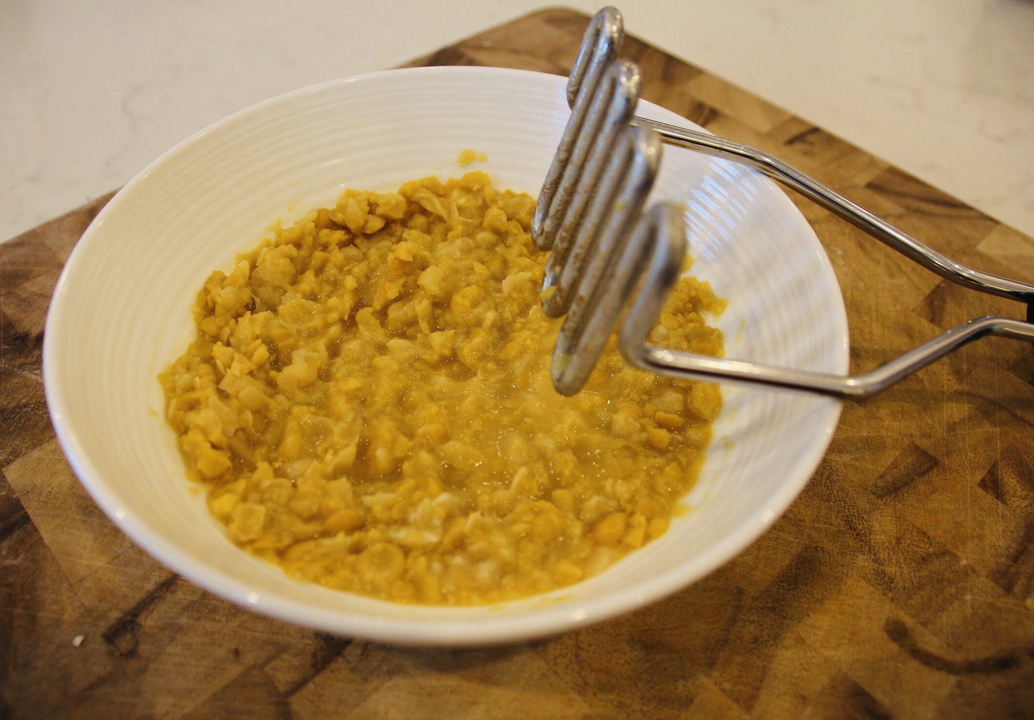 2. Drain and set aside. Take ½ cup of the cooked chickpeas in a bowl and mash with a potato masher. Add a wee bit of water to help with the mashing. Set aside. Do not use an immersion blender.