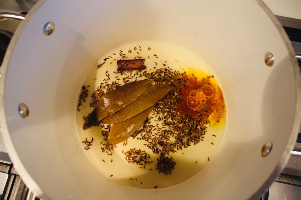 3. Heat oil in a large pot on medium high heat. Add cumin seeds, bay leaves and cinnamon stick.