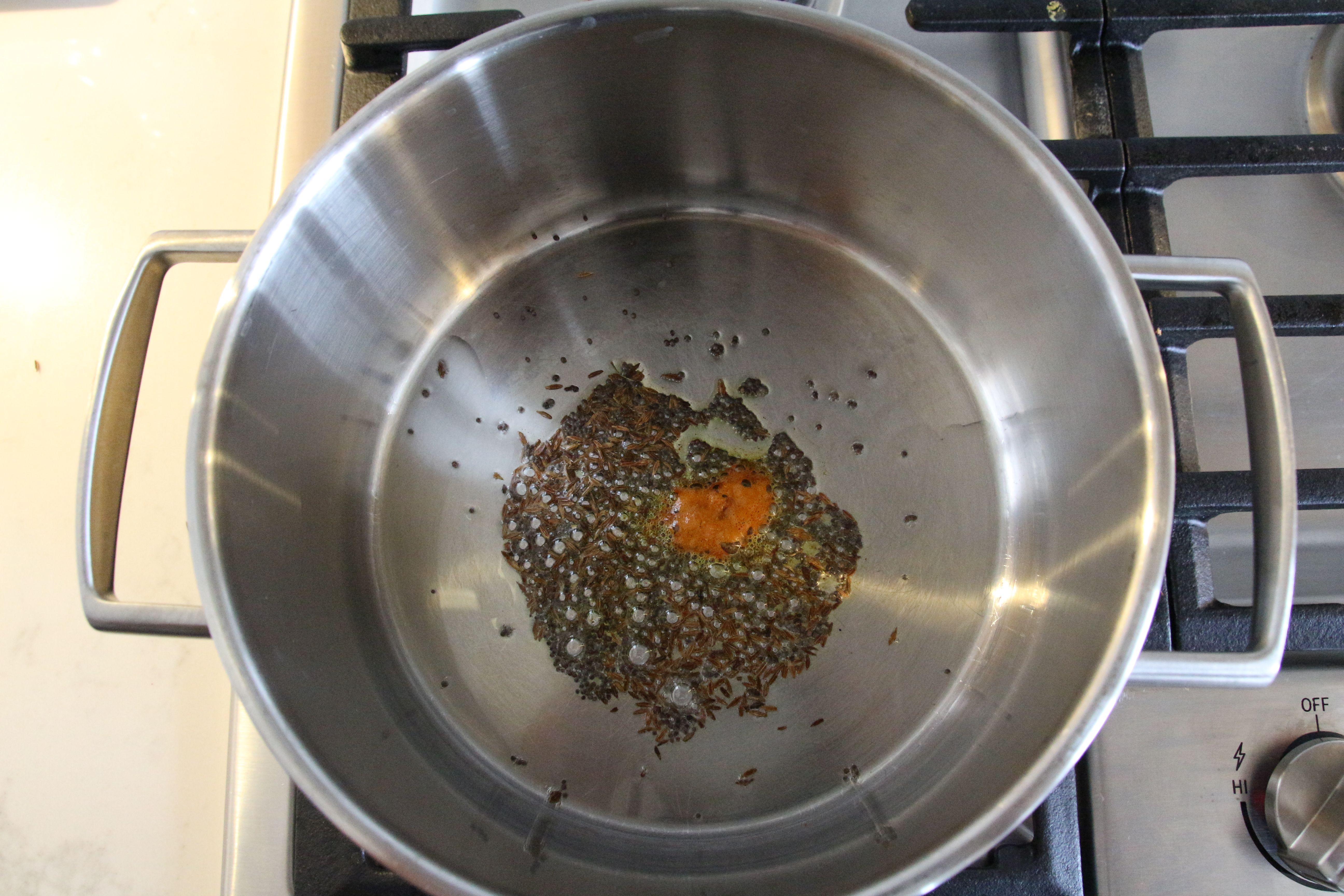 1. Heat oil in a pot. Add mustard seeds and cumin seeds.