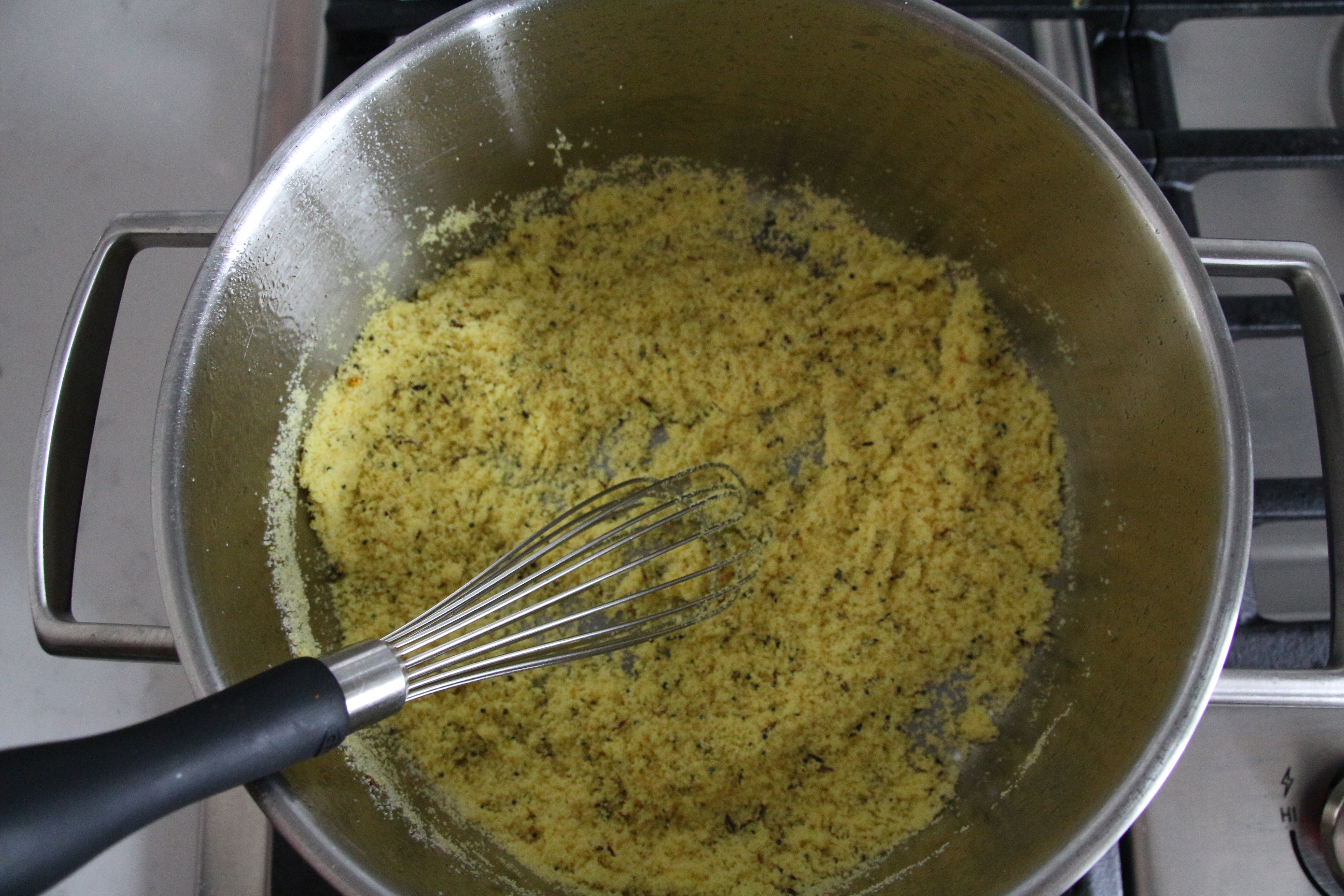 3. Turn heat to low. Add the semolina. Mix for about 1-2 mins on very low heat.