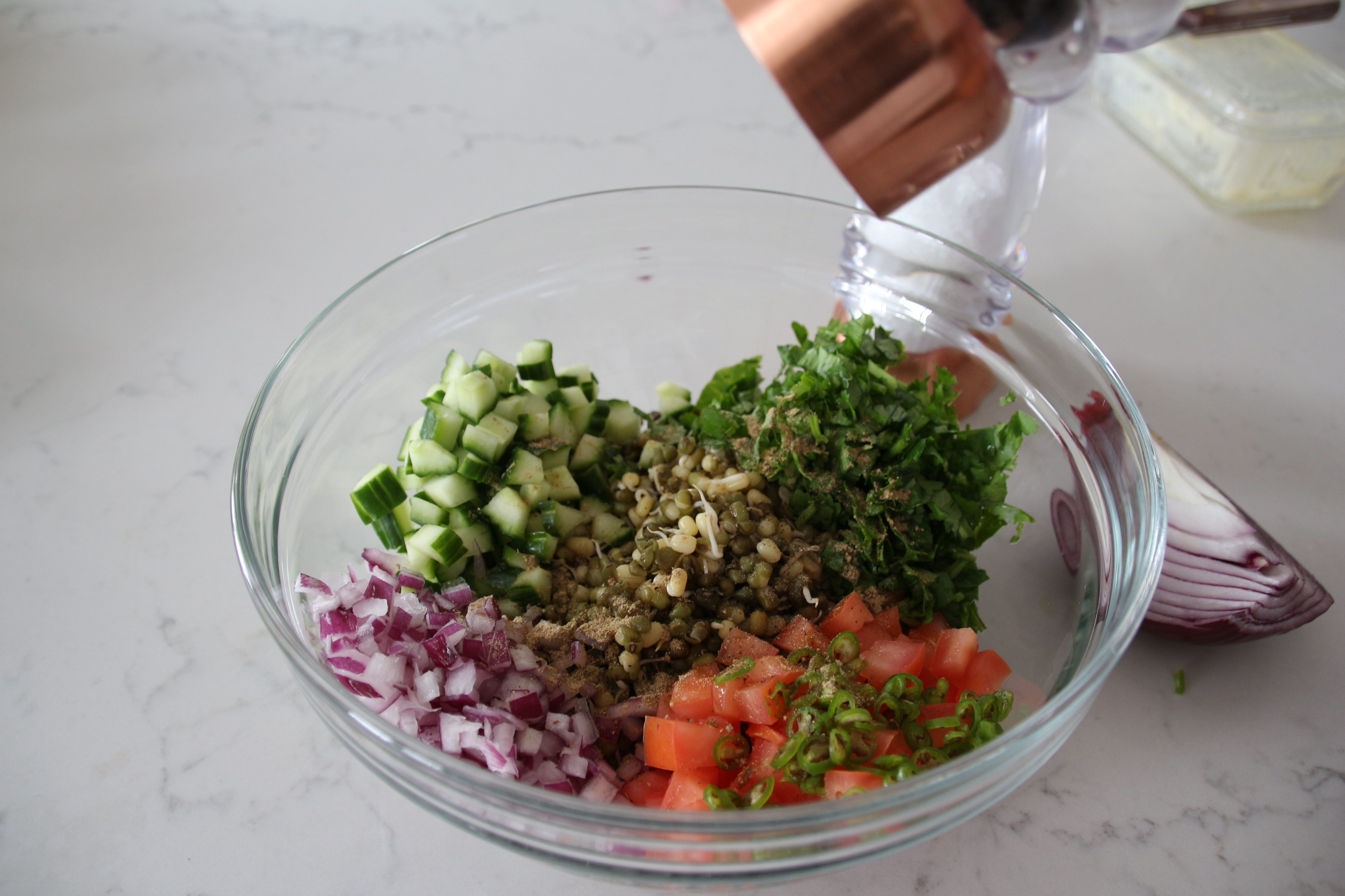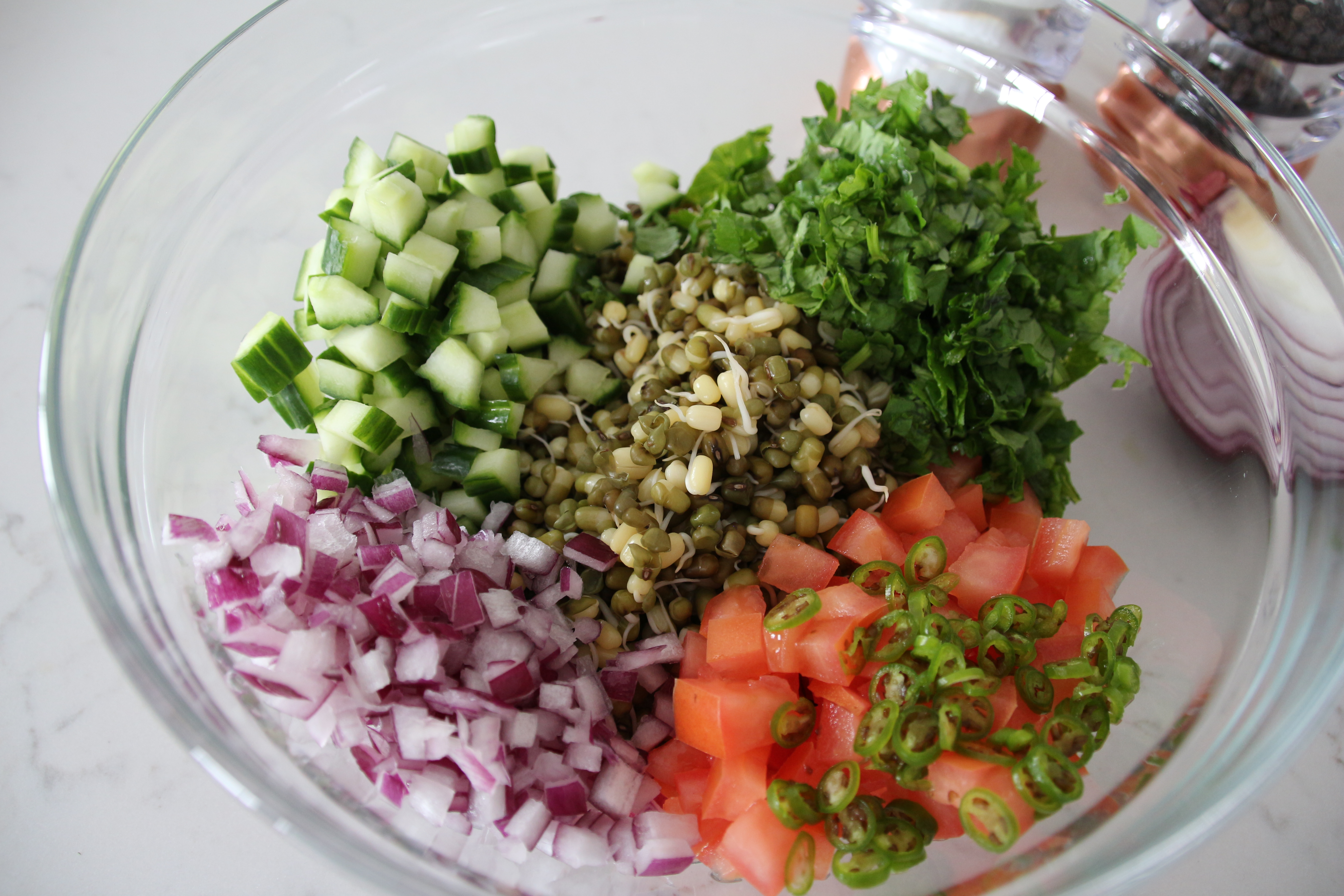 This salad is a perfect side or great on it’s own. It makes a healthy lunch too! The next day I heated oil in a pot with some mustard seeds, cumin seeds and a bit of turmeric. I added the salad mixture to it and it tasted delish!