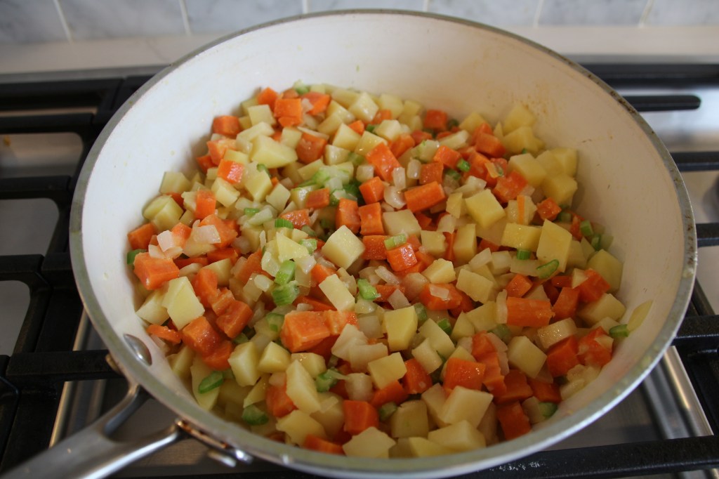 2. Add the carrots, celery, potatoes and onions along with some salt and pepper. This helps the veggies cook faster! Cook it for about 10 minutes, covered.