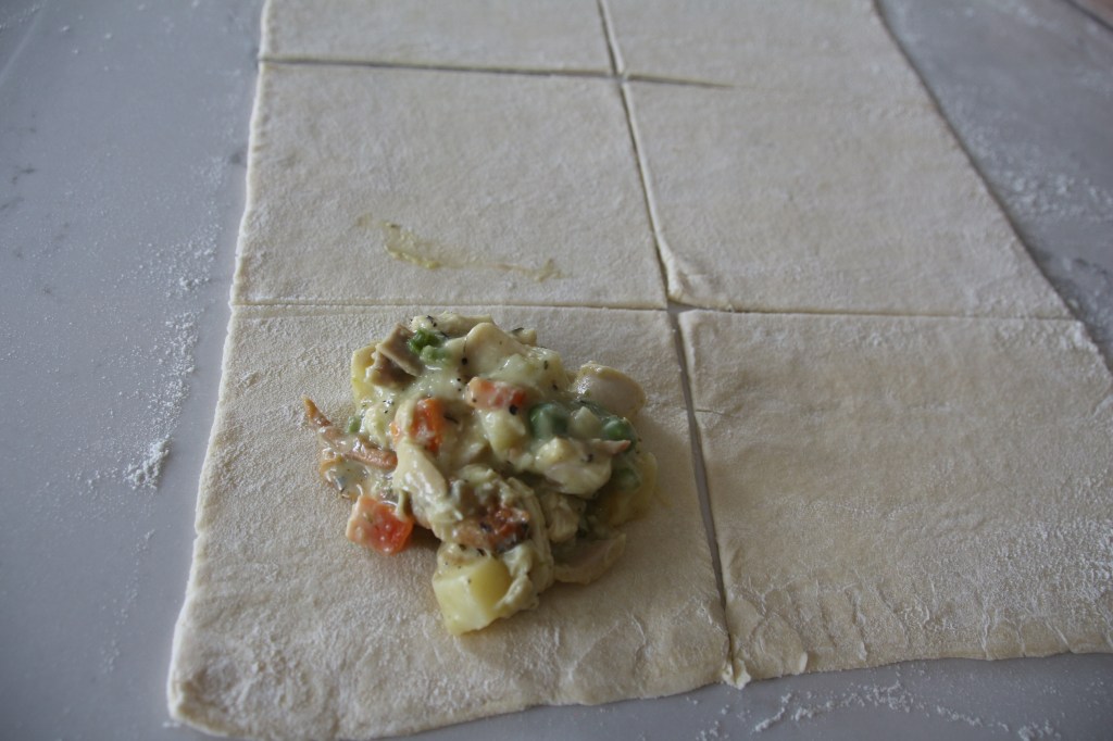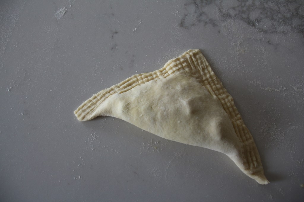 11. Spoon the chicken mixture into the center of the dough, and pick up two opposite corners to form a triangle.Press the other two sides down and use a fork to seal it further – I also use the fork to add the indents for design!