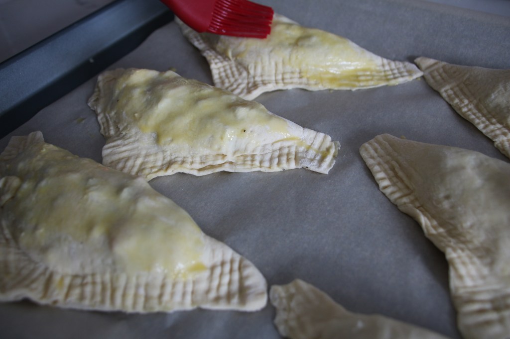 12. Place parchment paper onto baking sheets and put the turnovers onto the baking sheets.