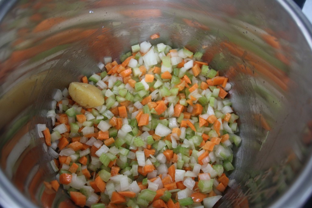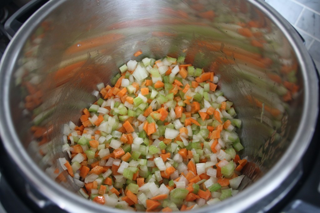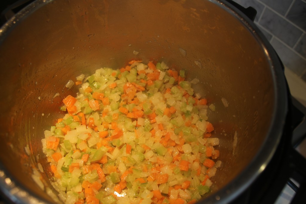 1. Heat olive oil in the IP on Saute mode (High). Toss in onions, carrots and celery. Add salt and pepper. Cook for 3-4 mins or until the onions are translucent.