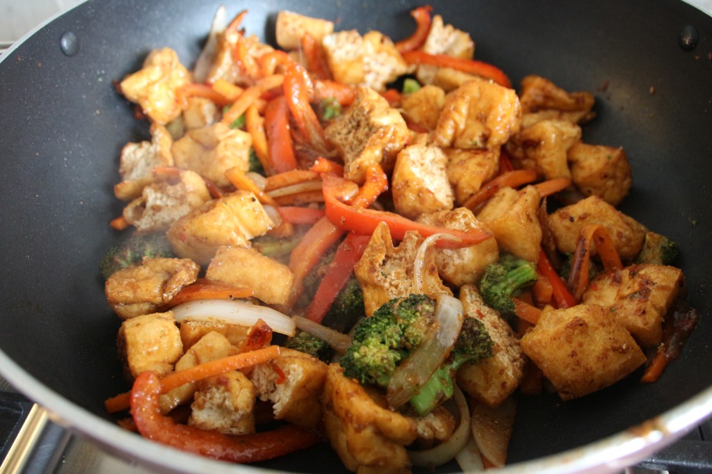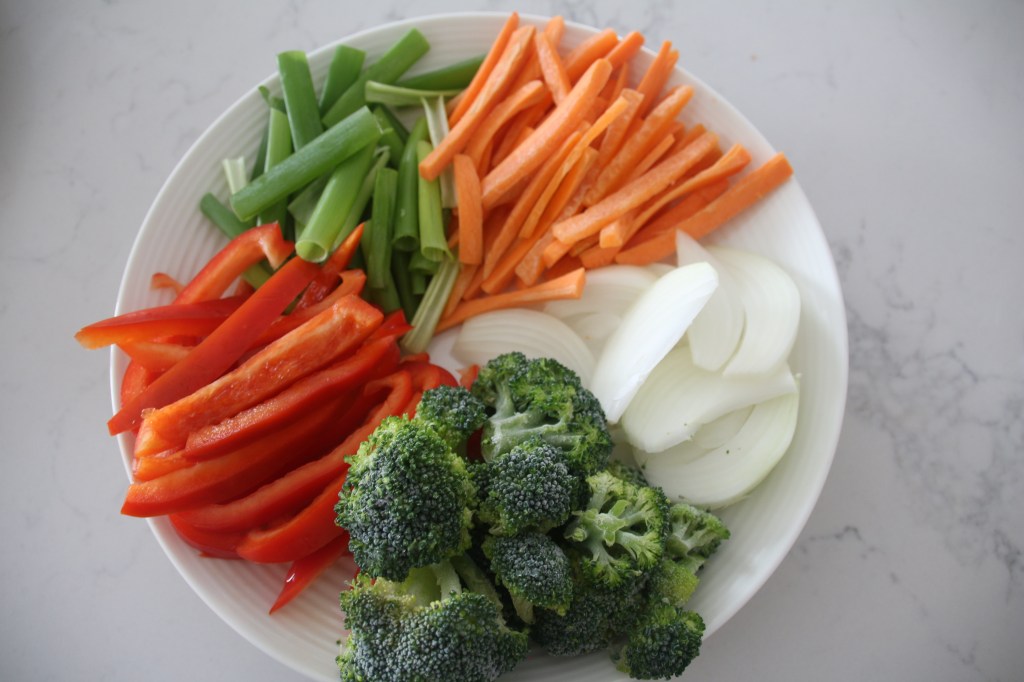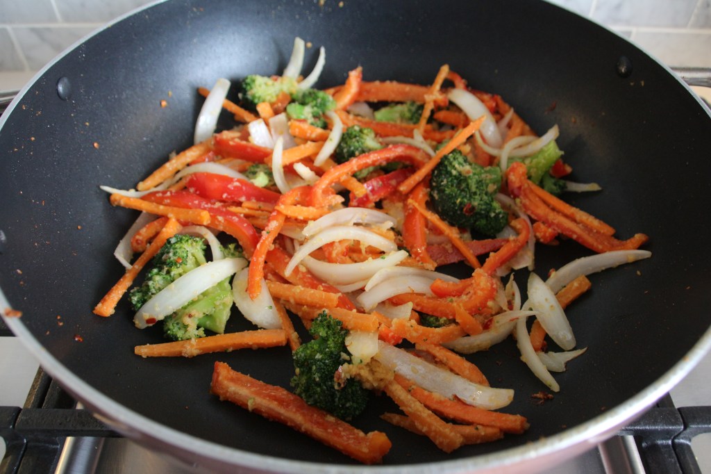 5. After about 1-2 minutes, add onions, red peppers, carrots and broccoli. Mix well and cook for 2-3 minutes.