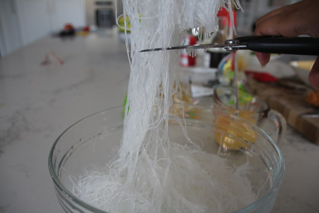 3. Drain and chop the noodles as per picture above. Keep chopping. The shorter the noodles, the easier it is to eat.