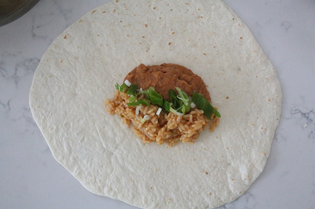 2. Put a spoonful of beans and rice (optional). See pictures above.