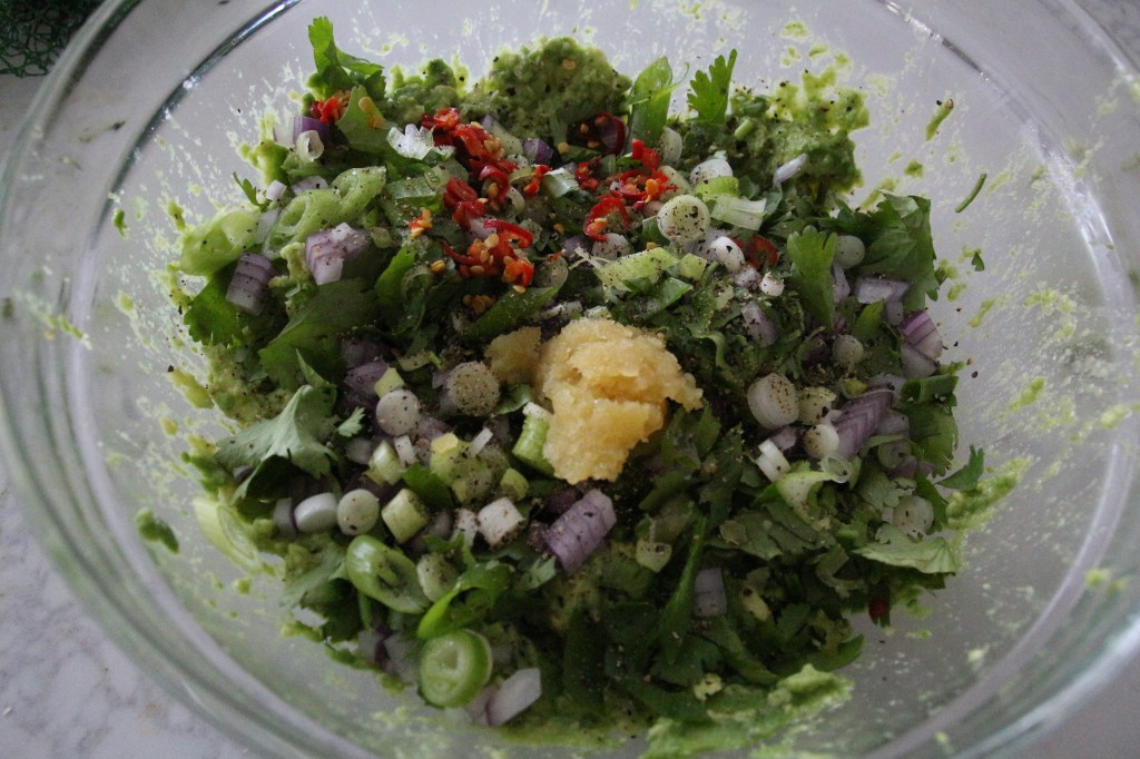6. Add in sugar, cumin powder, cilantro and hot chili powder.