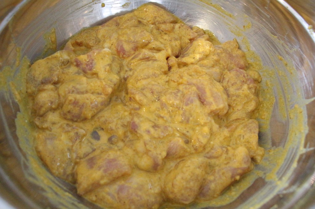 1. Combine the chicken and marinade ingredients in a mixing bowl. Refrigerate for 15 minutes.