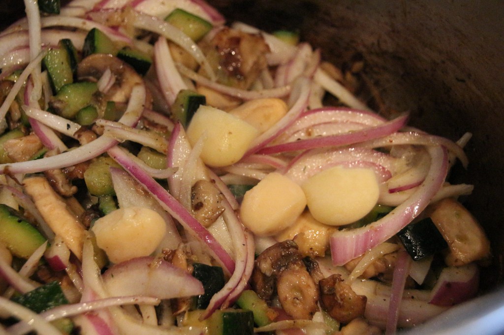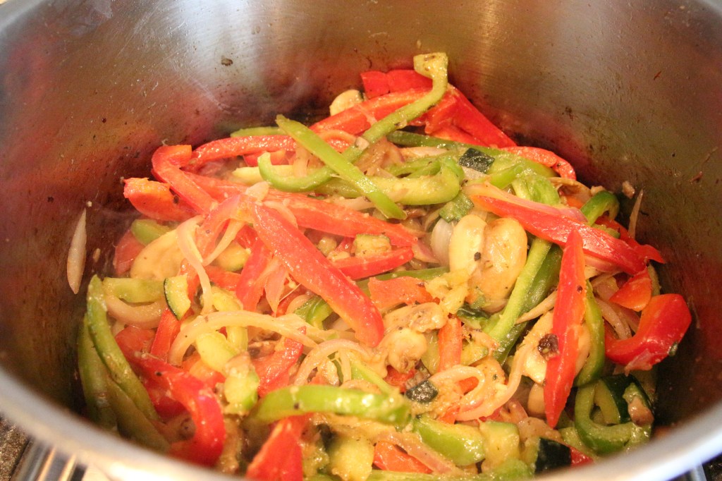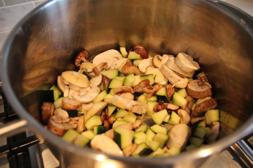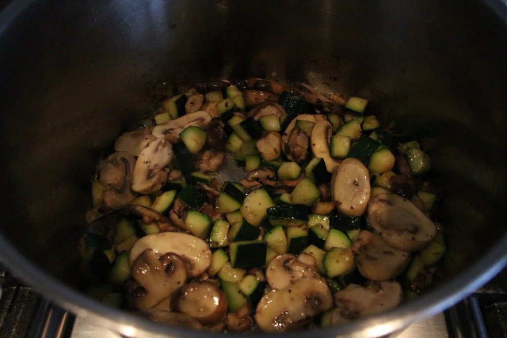 4. Add zucchinni and mushrooms. Sauté until all the water has evaporated.