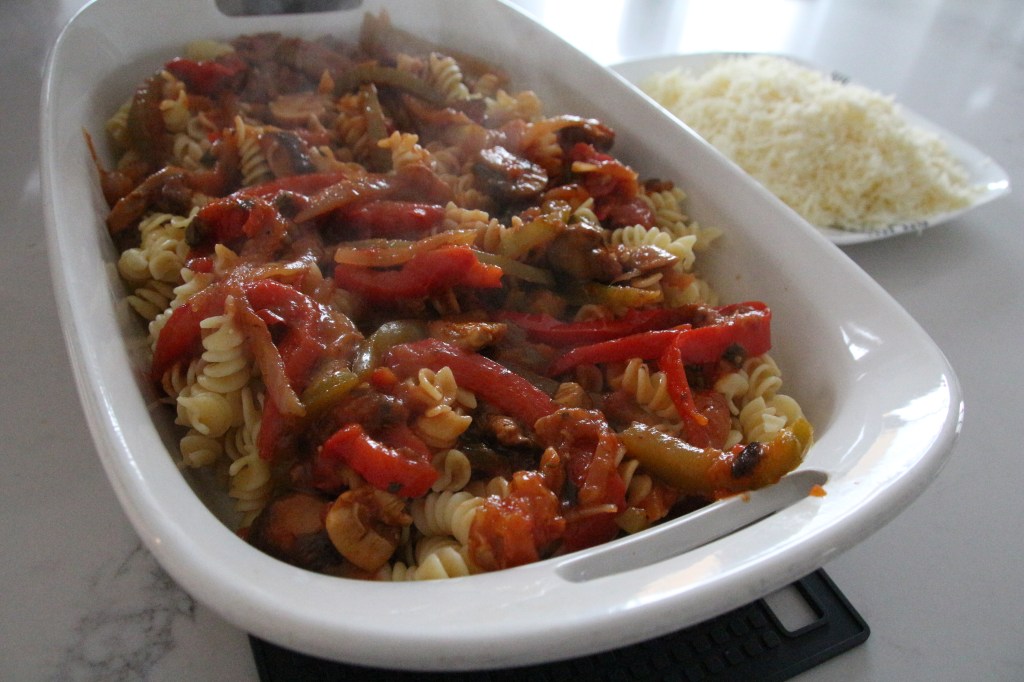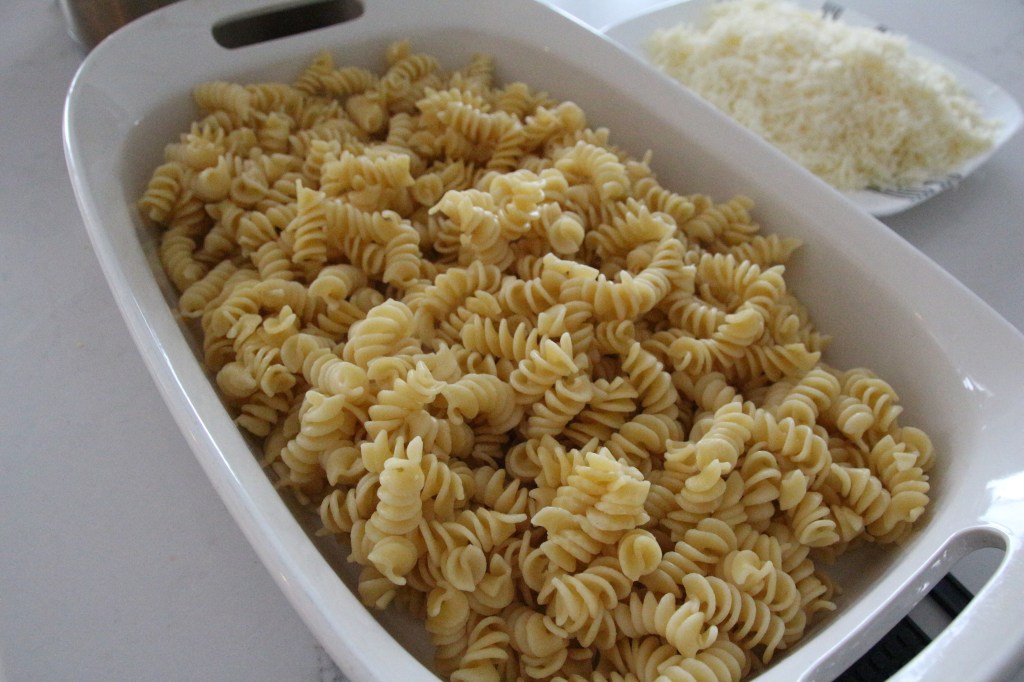16. Then, sprinkle the remaining cheese over the pasta as a top layer. If you have some grated Parmesan, throw some on there too!